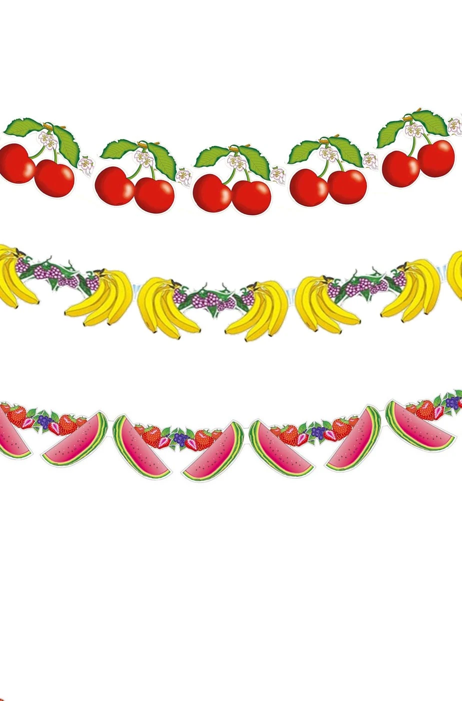 Ben nove metri di striscioni per preparare al meglio la tua festa tropicale con tanta frutta coloratissima. Il pacchetto include tre striscioni di cartoncino da festa lunghi 3 metri ciascuno così ripartiti