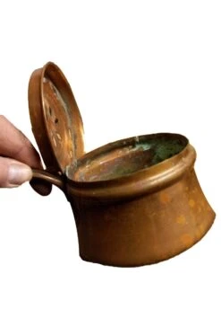 Antico scaldaletto di rame d’epoca con la bocca superiore di diametro di circa 15cm, con manico e coperchio da utilizzarsi come decoro per la cucina oppure vaso das fiori di rame ma anche come oggetto di scena per scenografie a tema contadino, case delle streghe di Hansel & Gretel.