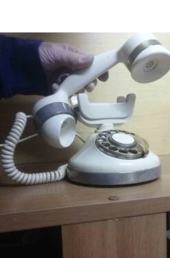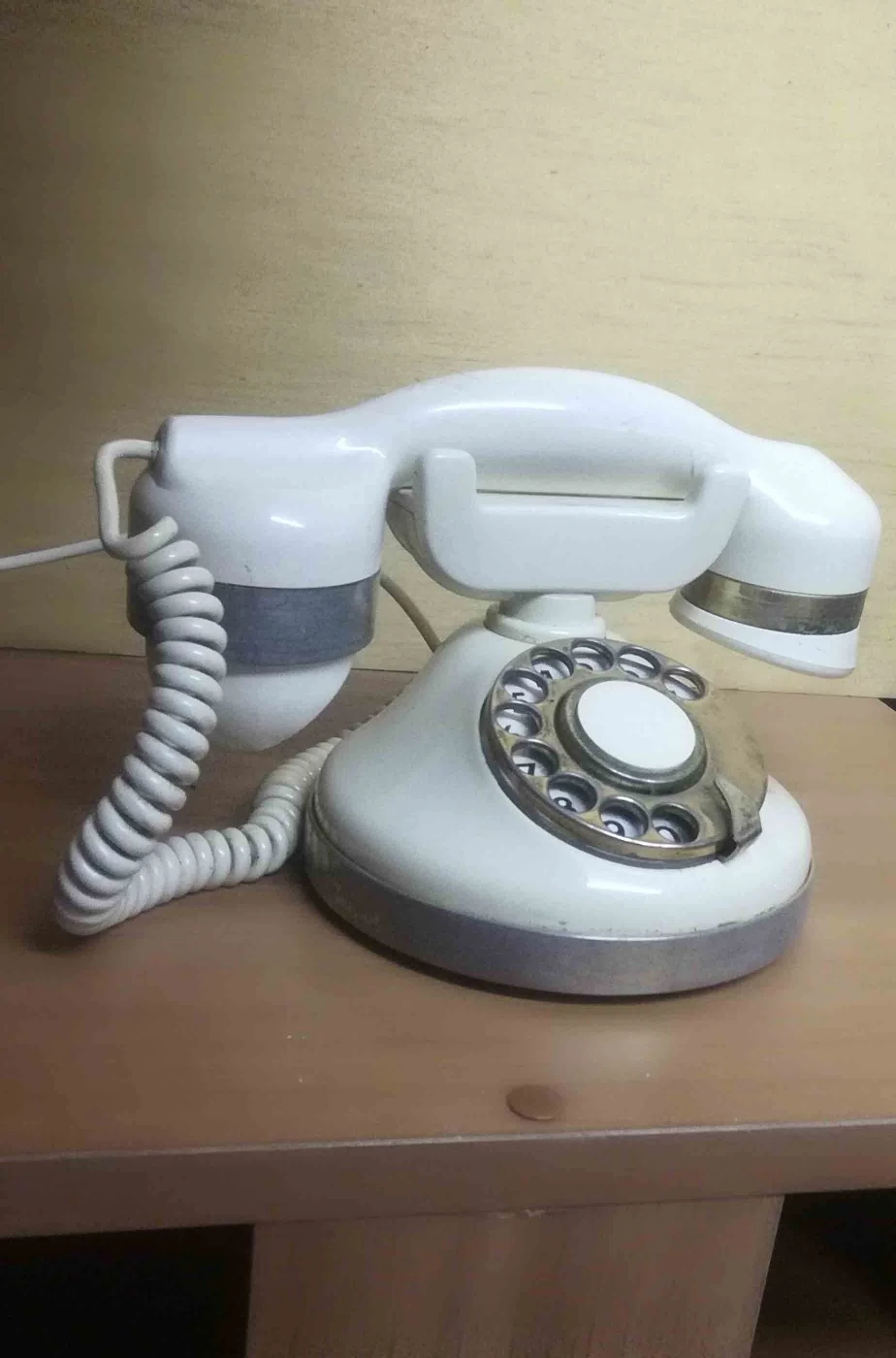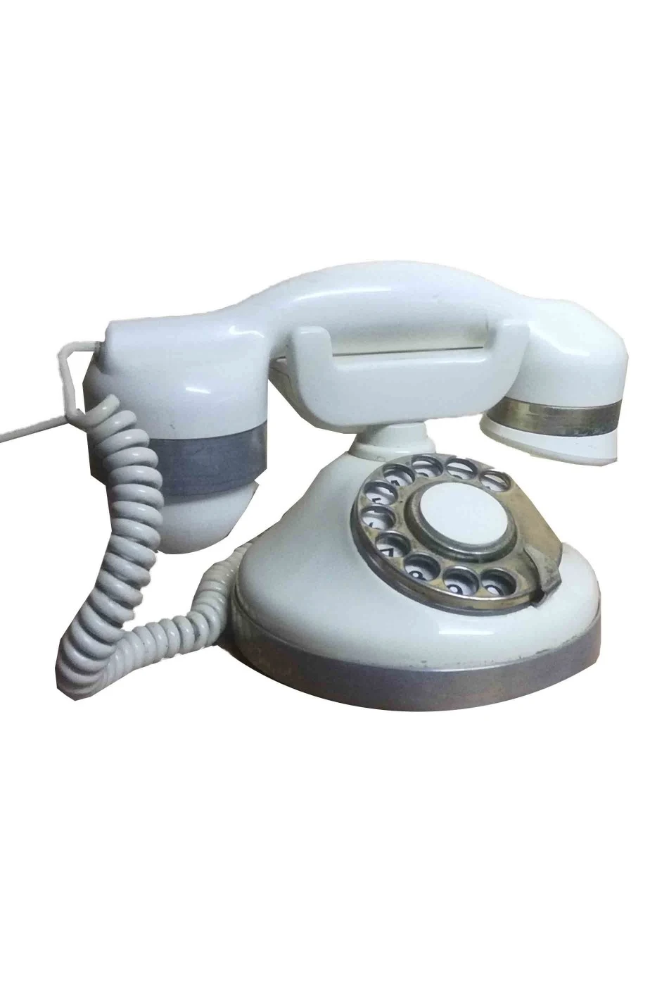 Telefono a disco bianco d’epoca di bachelite con filo a spirale