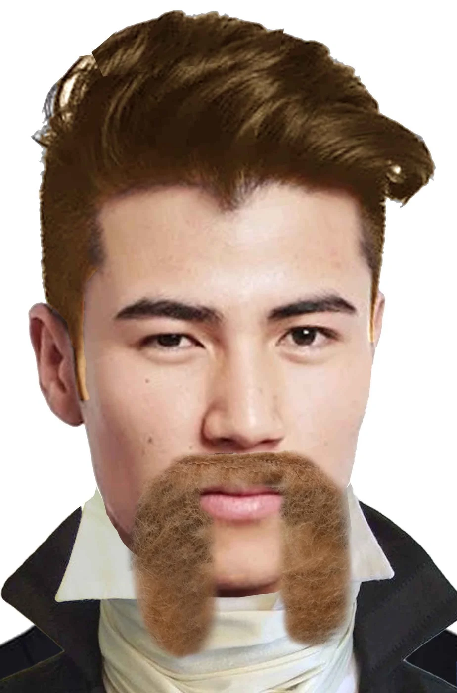 Sono un paio di baffi finti castani folti e lunghi verso il basso come usava nell’800. I baffi favoriti o prussiani ideali anche come baffi finti tirolesi o bavaresi.
