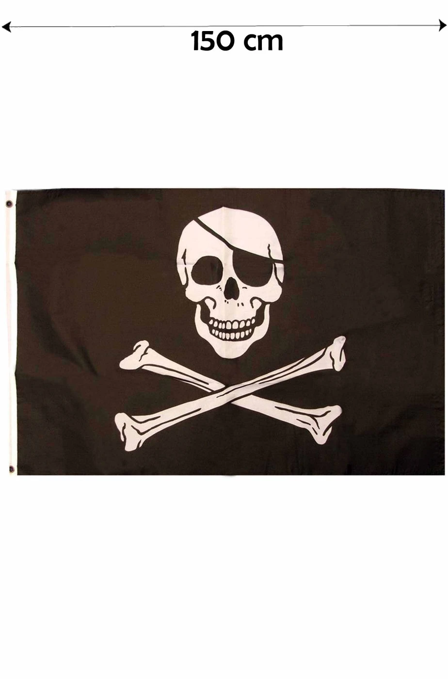 Bandiera dei pirati da allestimento nera con stampa del teschio con le ossa incrociate su un solo lato, il famoso Jolly Roger da appendere al muro nel tuo pub a tema o nel tuo locale per far capire che razza di pirati si trovino all’interno.
