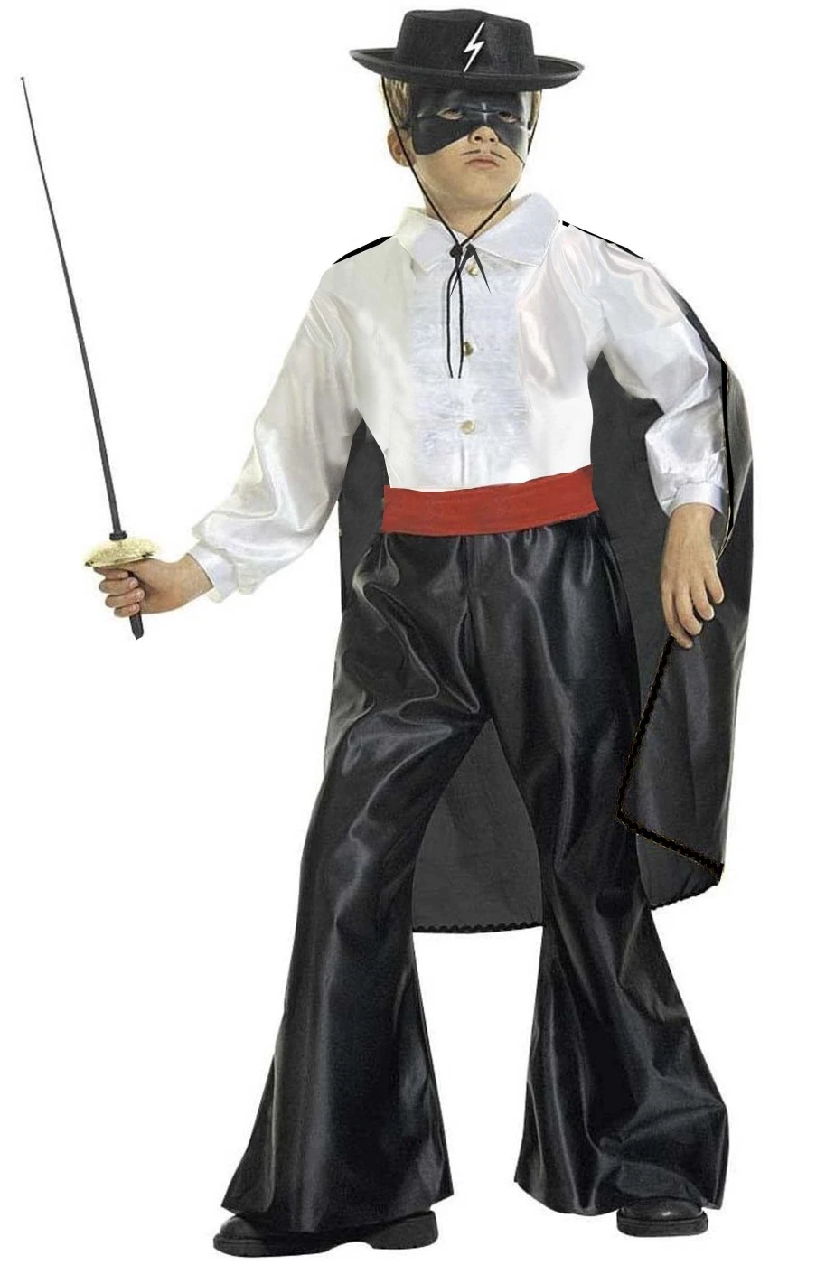 Per un bambino che ami la maschera piu’ classica del carnevale, questo vestito di Zorro elegante e’ composto dal vestito con la camicia bianca con la rouche ed i pantaloni in un unico pezzo, il mantello, la cintura rossa e la maschera.