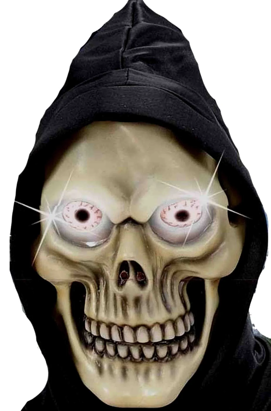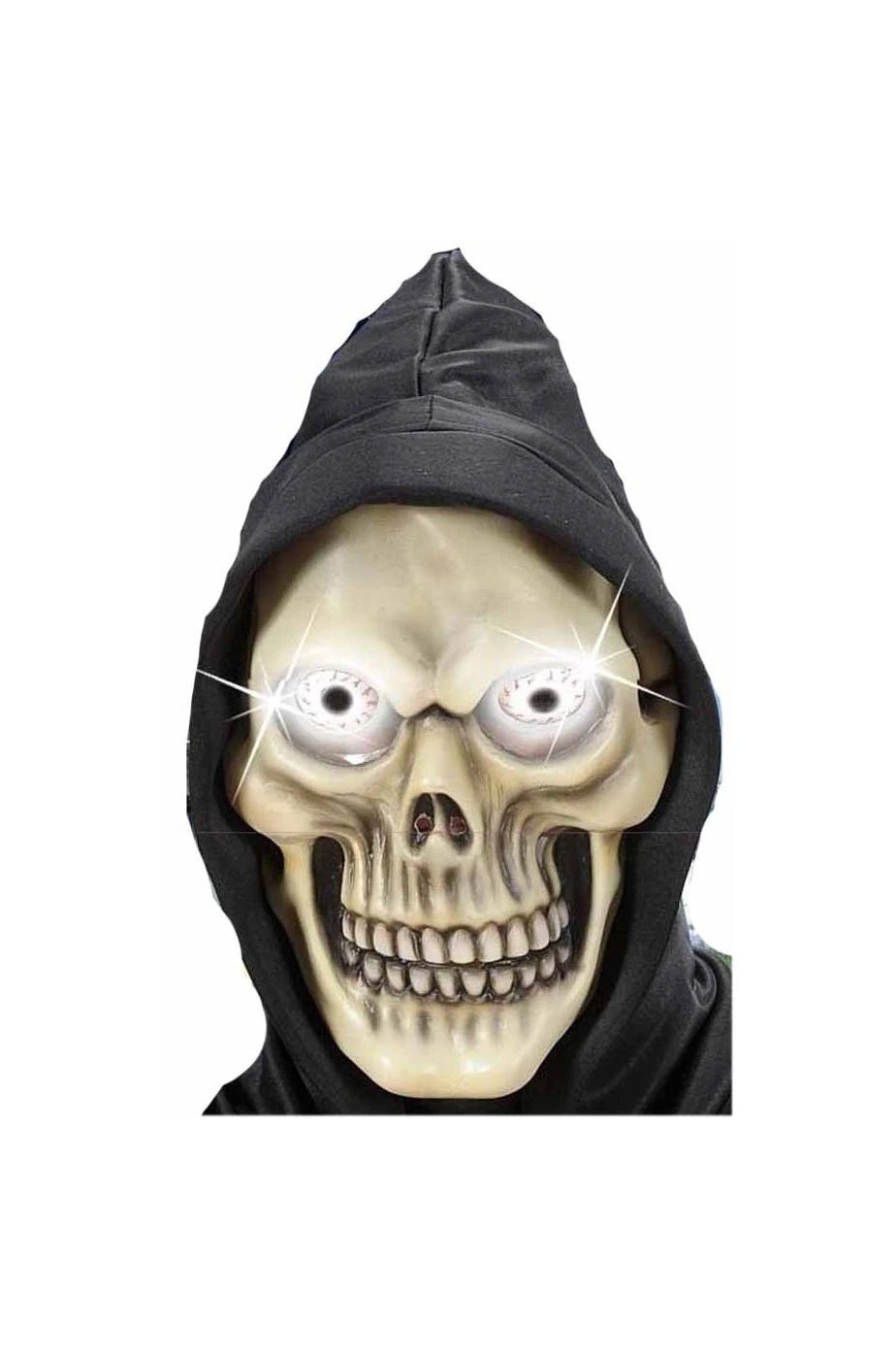 Impressionante maschera da adulto a 3/4 di testa (dietro copre fino alla nuca, NON copre il collo posteriore). Molto grande e leggera consente un’ottima traspirazione. Fornita di due luci a led alimentati da due batterie AA non incluse, e’ una maschera di Halloween da teschio davvero impressionante per tutte le tue feste a tema la sera di ognissanti.